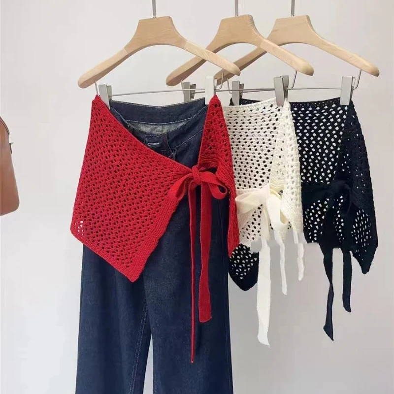 Korean Style Hollow Square Knitted Fart Curtain Multifunctional Belt Headscarf Skirt Curtain Fashionable Versatile Women Shawl