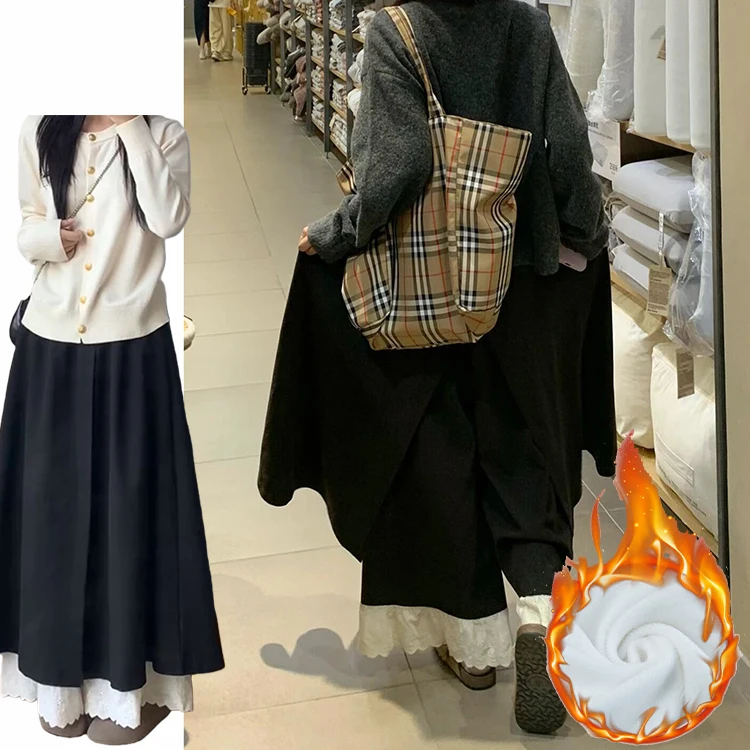 Retro Design High Waist Lace Splice Fce Lined Thi Wide Leg Skirt Pants Women Autumn Winter New Sle Casual Pants