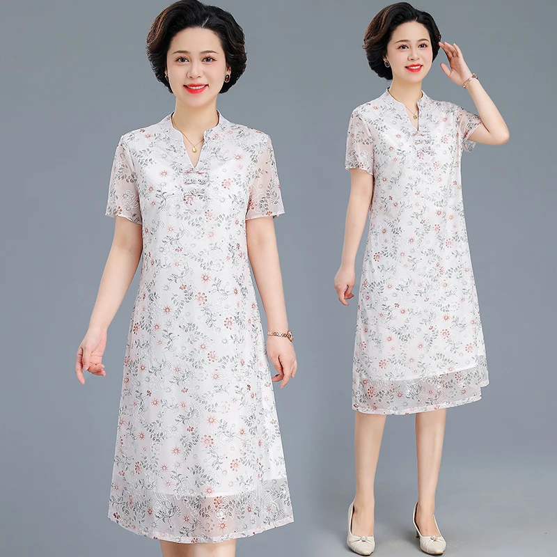 Faionable Summer Mommy Dr Floral Print Chiffon ort Sve mid Age Women's Clothing Improved Loose Fit V-ne