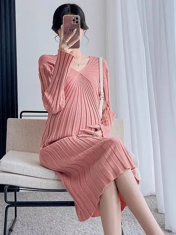 Pregnant Women's Long Sve Knitted Sweater Dr V-Ne Simple Faionable Base Layer Women's Autumn Clothing Long Dr