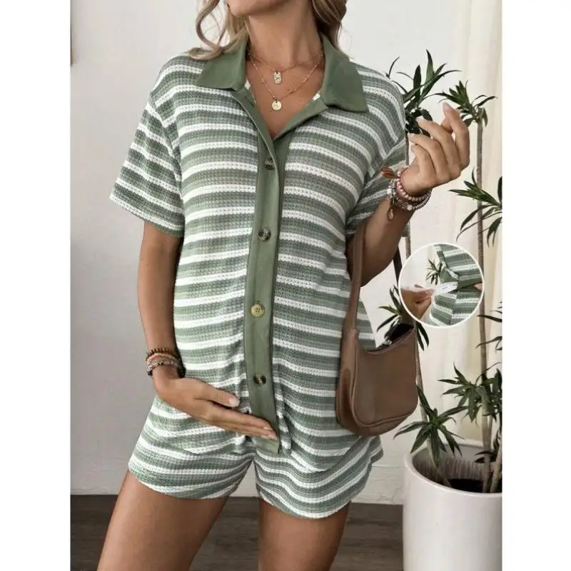 New adient Stripe Materni irt Elastic Waist Design Eight-Sve Ne Sle for Pregnant Women Comfortable Home Wear