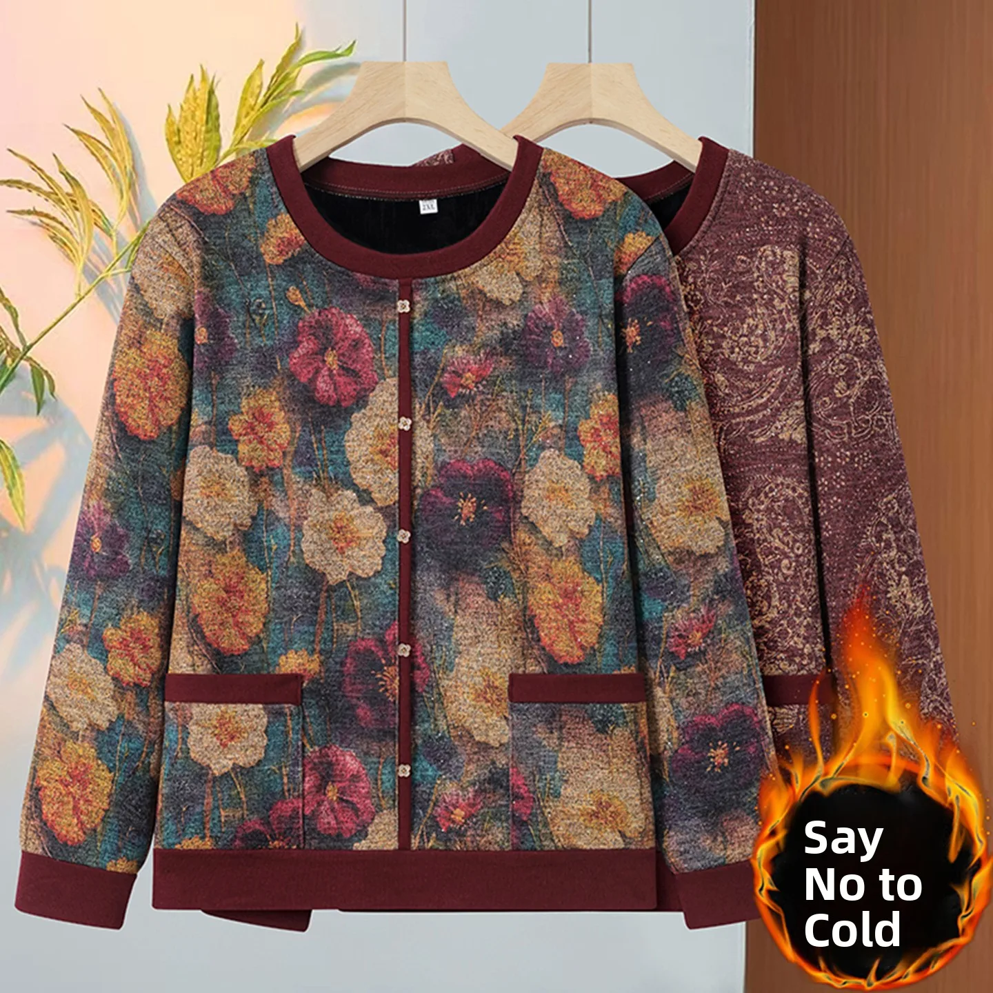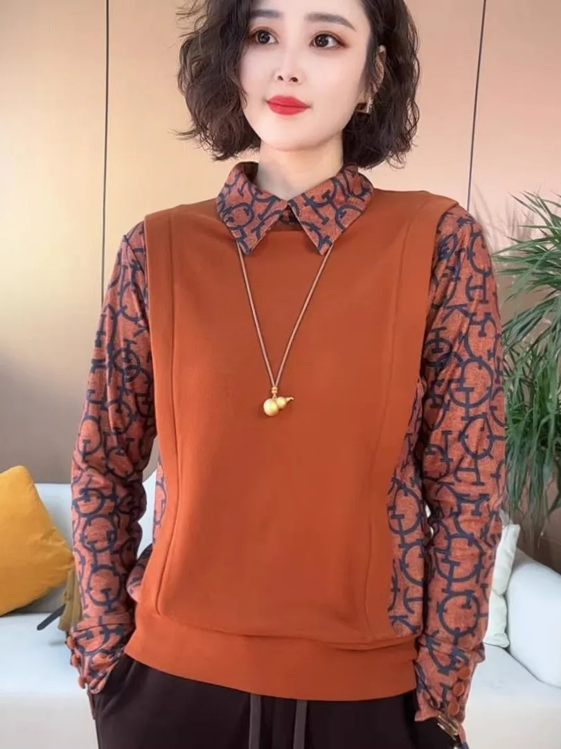 Warm Fce Lined Loose round Ne Top for Women Autumn Winter Faion Anti-Aging Mommy Clothes andmother Sle Base irt