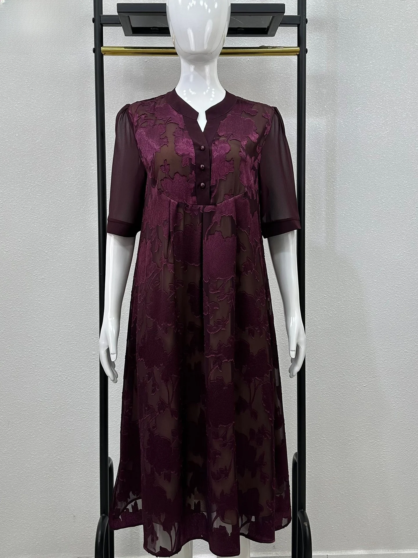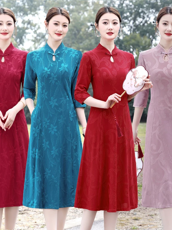 Retro Sle Mid-Length Qipao Dr with Seven-Bit Sves for Middle-Aged And ly Women Faionable Slimming Mommy Clothes