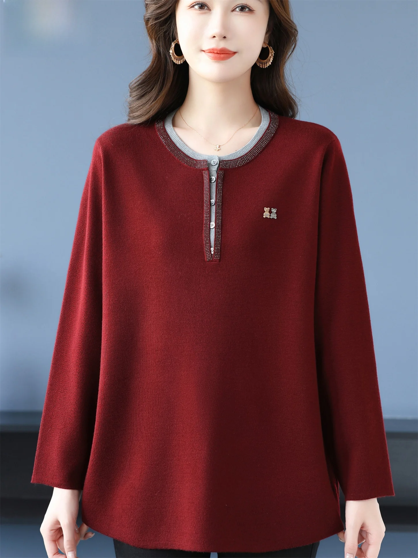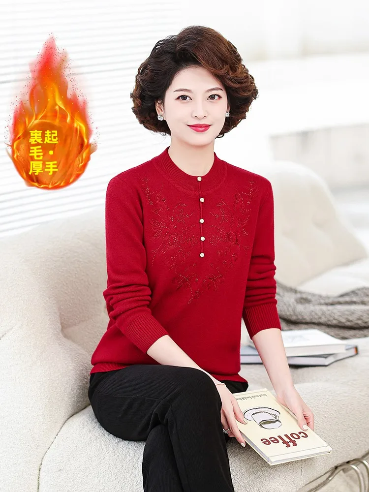 Faionable Thiened Fce Mommy Sweater Red Color for Women Middle-Aged And ly Winter Basic Top Attractive Outerwear