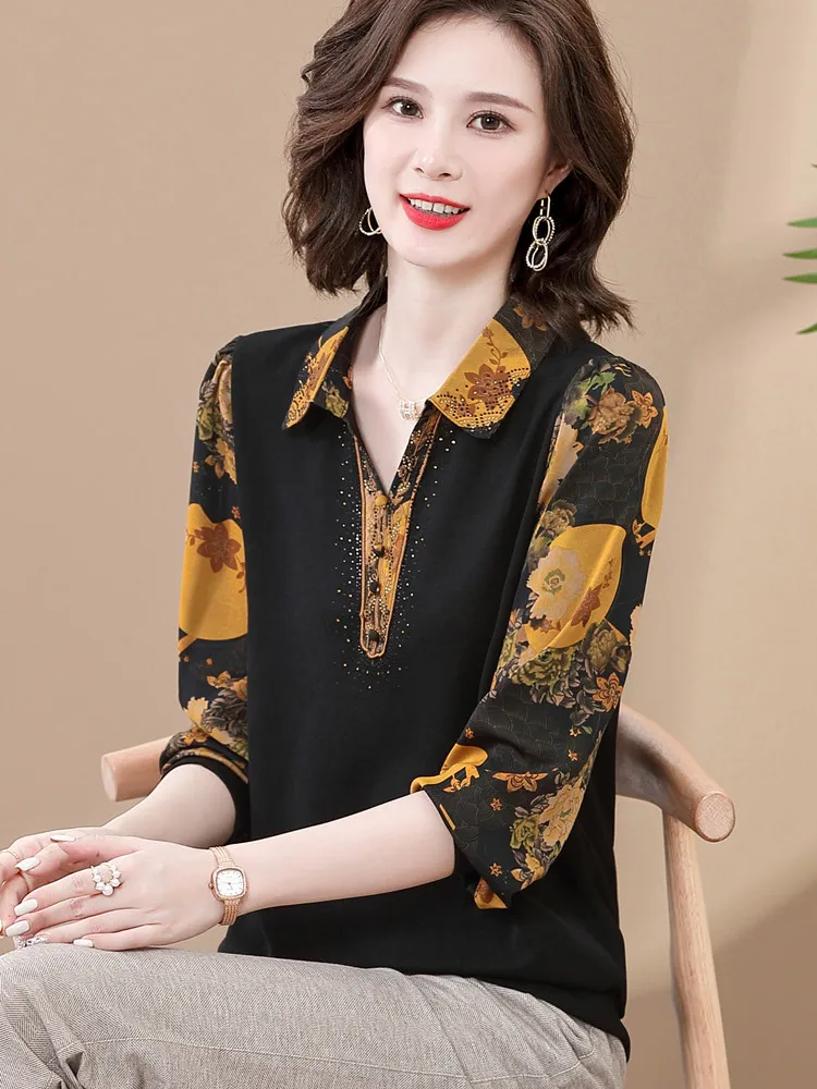 Faionable Knitted Long Sve irt Spring Clothing for Women over 50 Years Old Collar Loose Fit Regular Thin