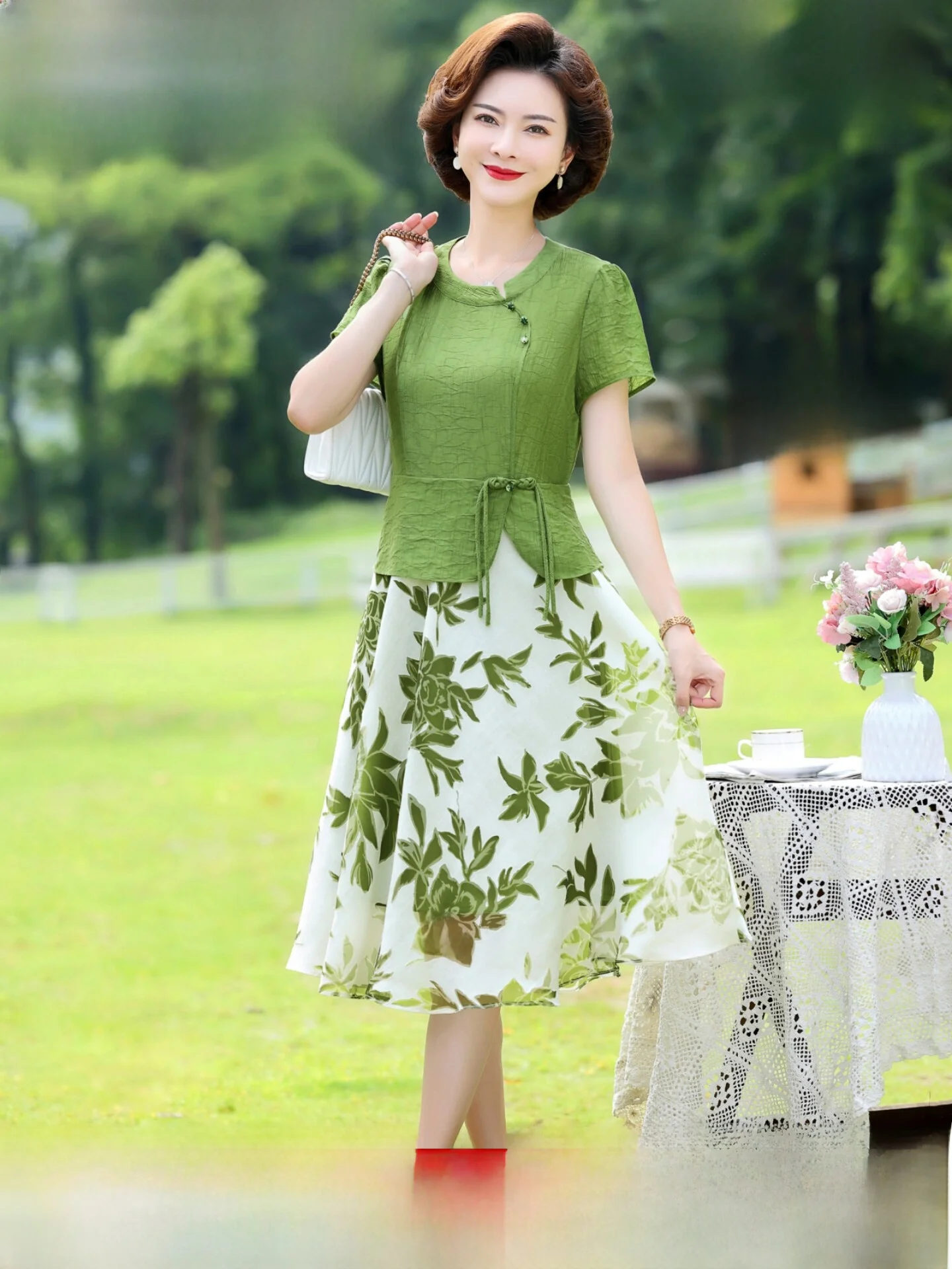 Ele Midlife Mom Summer Dr Faionable Senior Women's Clothing Breathable Lightweight Printed Dr with Button Detail