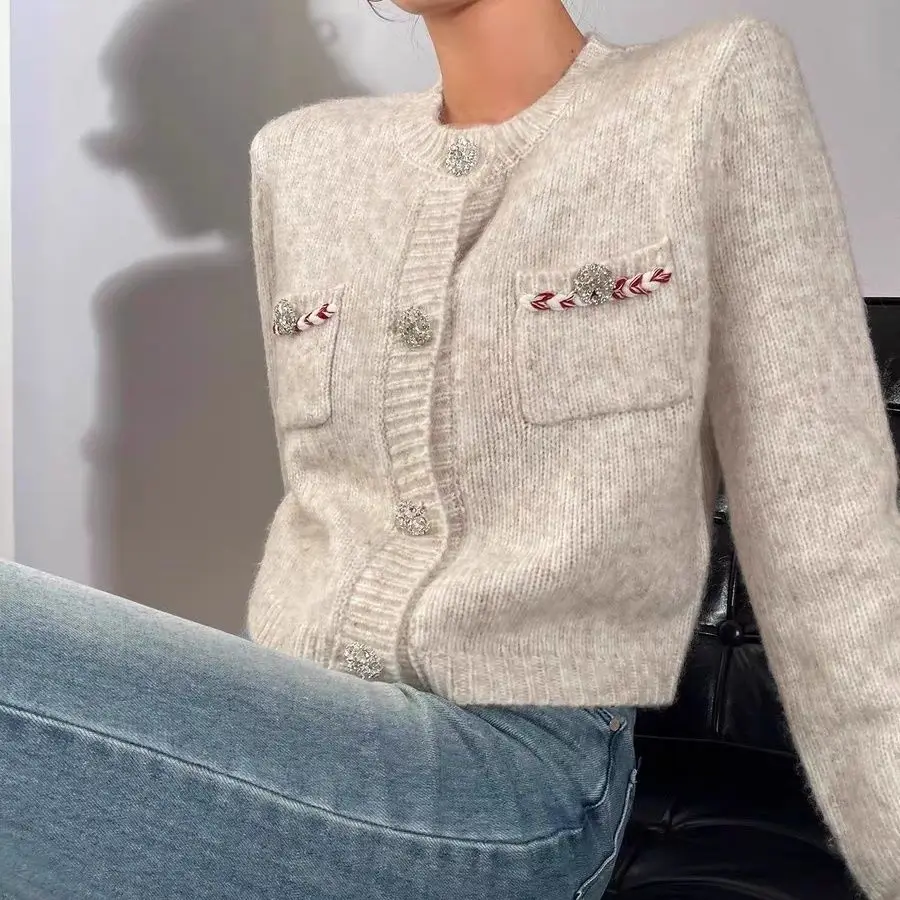 Mixed Color Diamond Buckle Loose Knitted Short Top Luxury Fashion Sweater Coat Fragrance Style Grandmother Grey Open Cardigan
