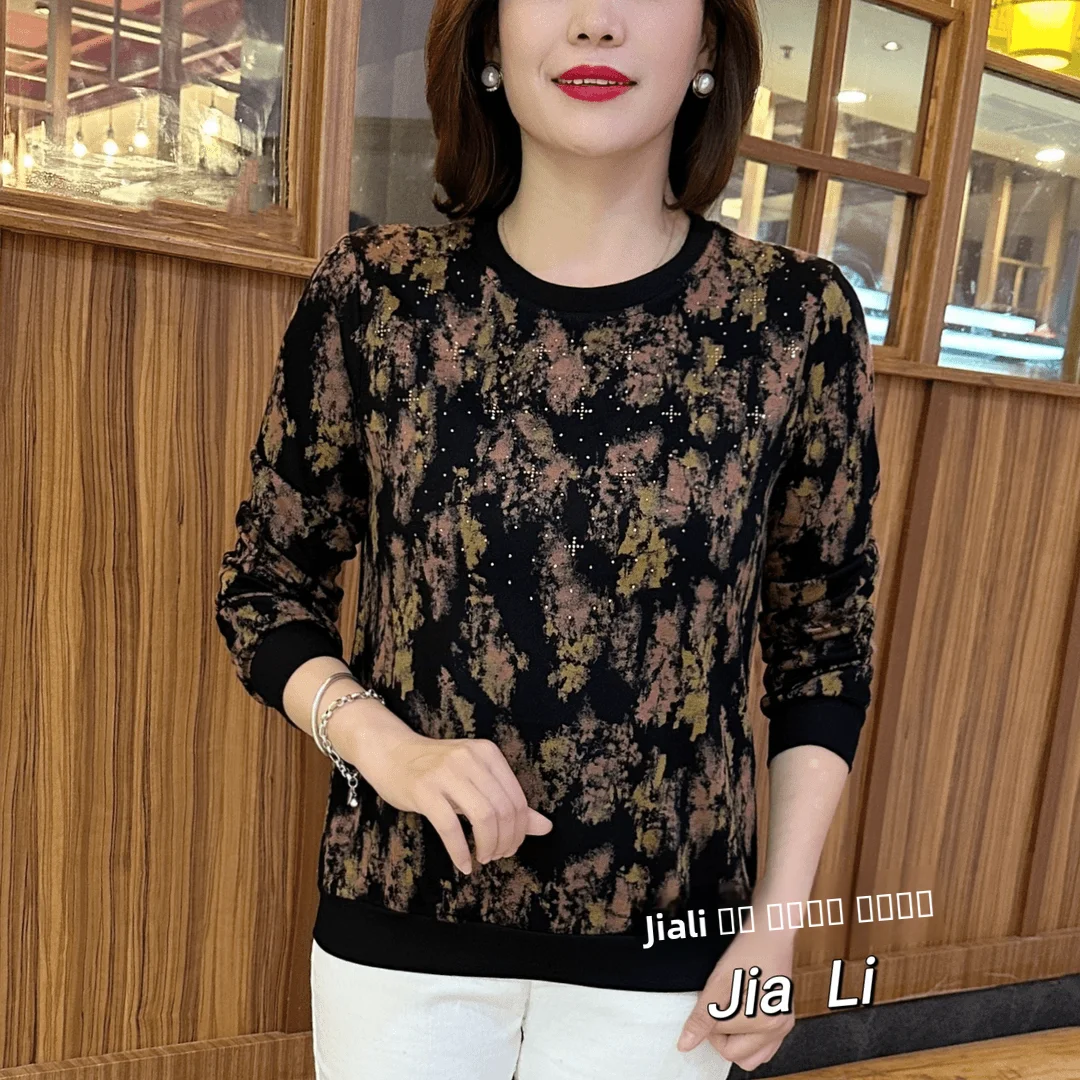 Faionable round Ne Rhinestone Base irt Slimming Ele Anti-Aging Mommy Sle Long Sve Top for Middle-Aged Women
