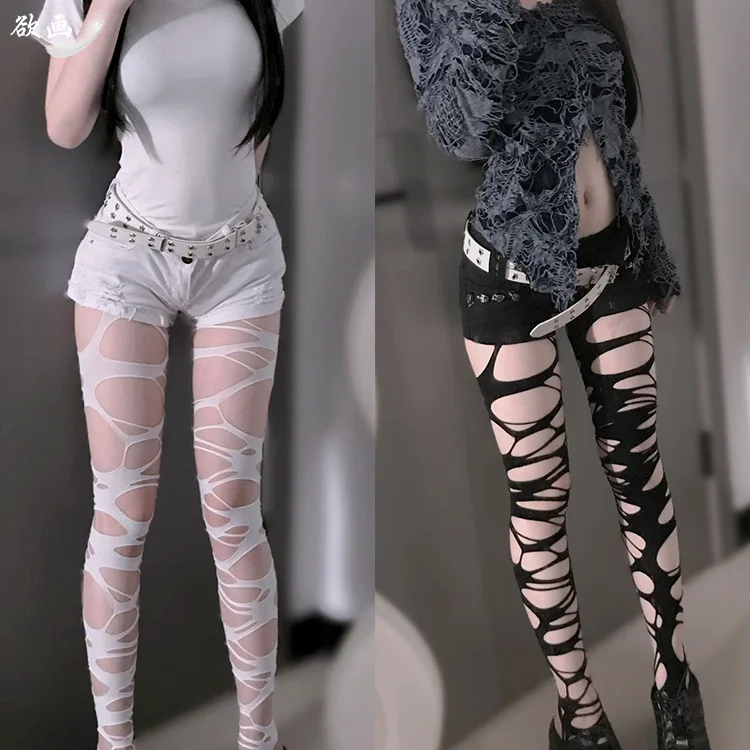 Lolita JK Ripped High Waist Stockings Punk Hollow Fishnet Stockings for Women Gothic Spider Web Stockings Rave Party Stocking
