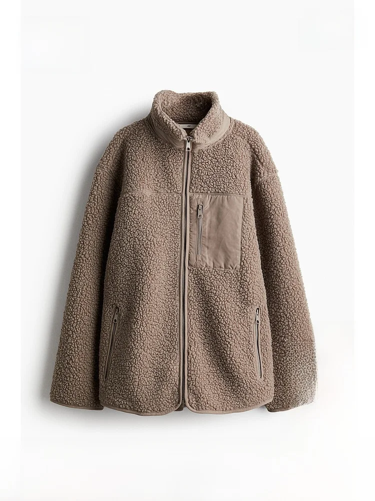 H&M Women's Teddy Fce Jaet Loose Casual Stand Collar ort Outerwear 239565 Faion Versatile Long Sve Polyester
