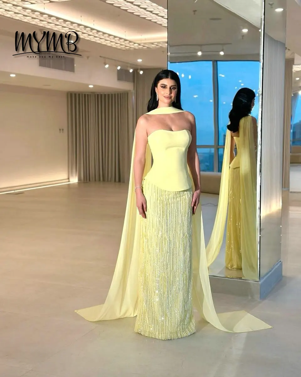 MYMB Luxury Chic Fashion Yellow Strapless Mermaid Evening Dress Pearl Embellished With Chiffon Scarf 2026 for Prom Party MY30200