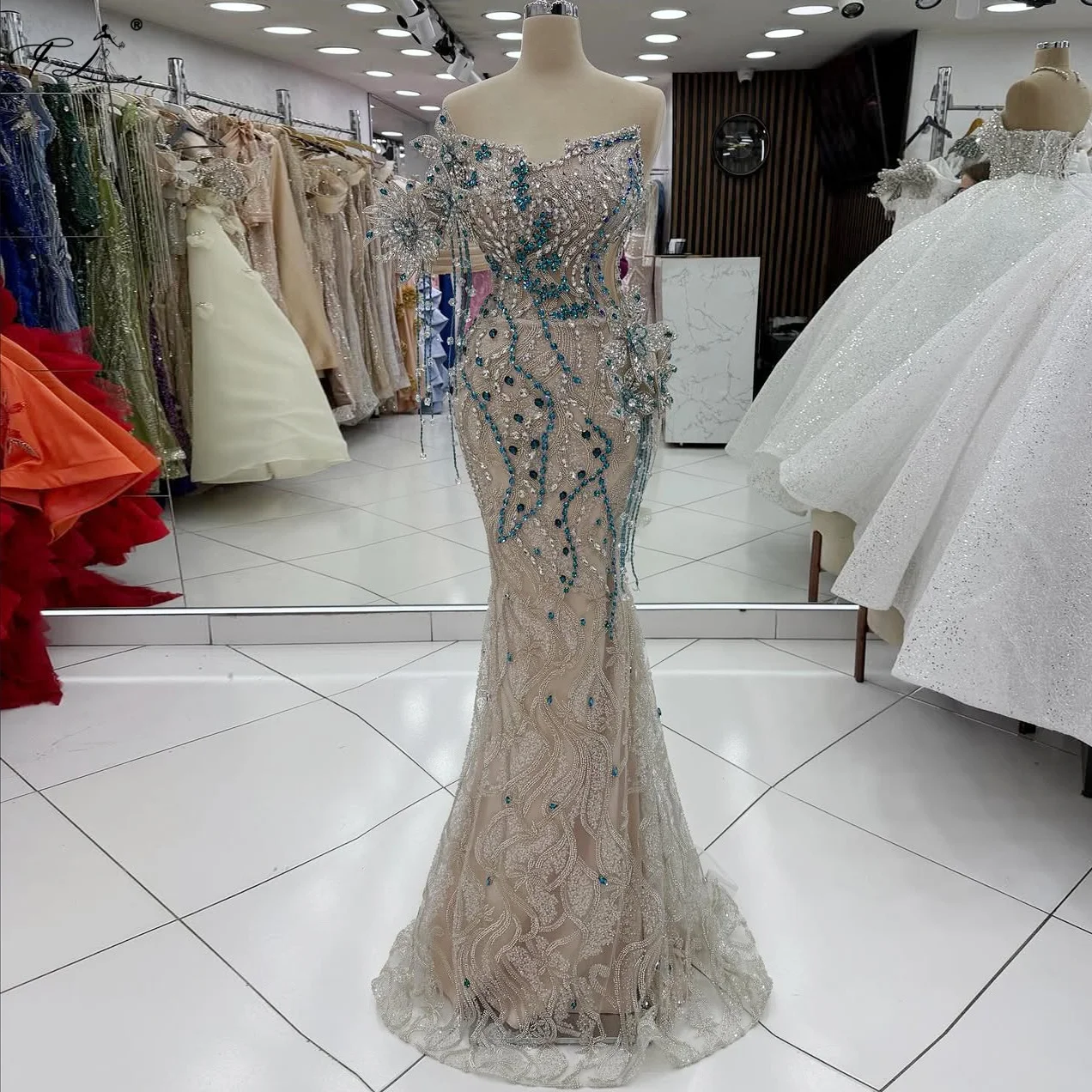 Crystal Flower And Tassel Evening Gowns Champagne Cocktail Dress Prom Dress Strapless Mermaid Gown Custom-Made Celebrity Gowns