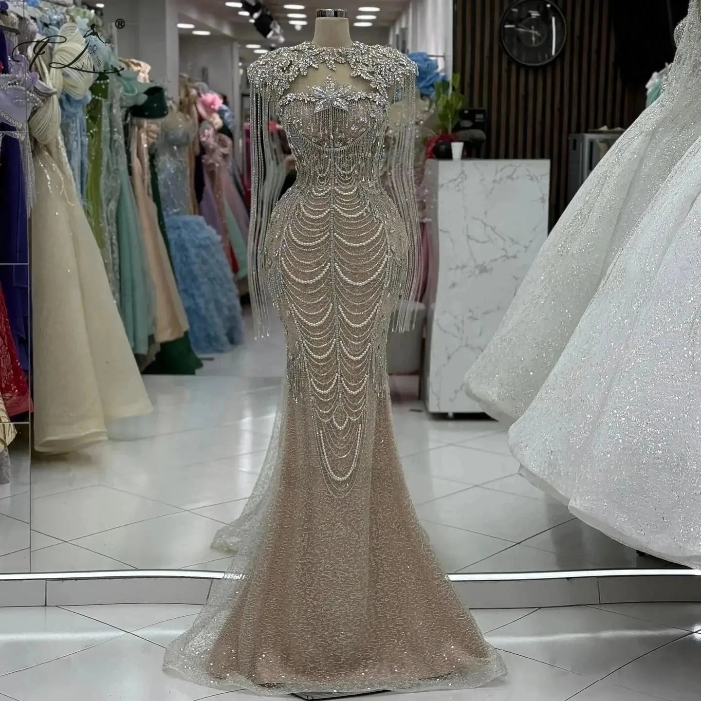 Luxury Champagne Celebrity Dresses With Pearls Mermaid Crystals Evening Gowns Red Carpet Dresses Customized Vestidos De Fiesta