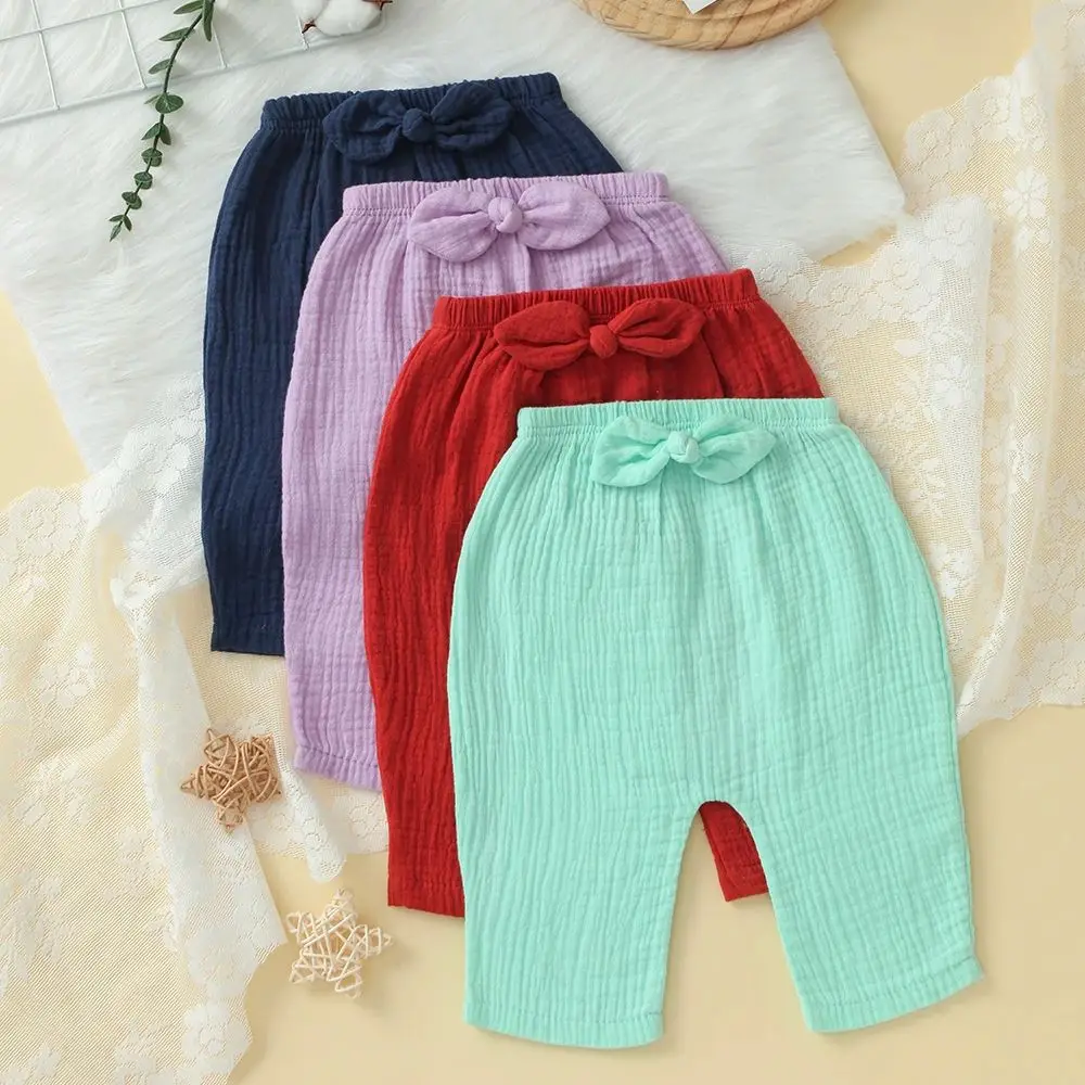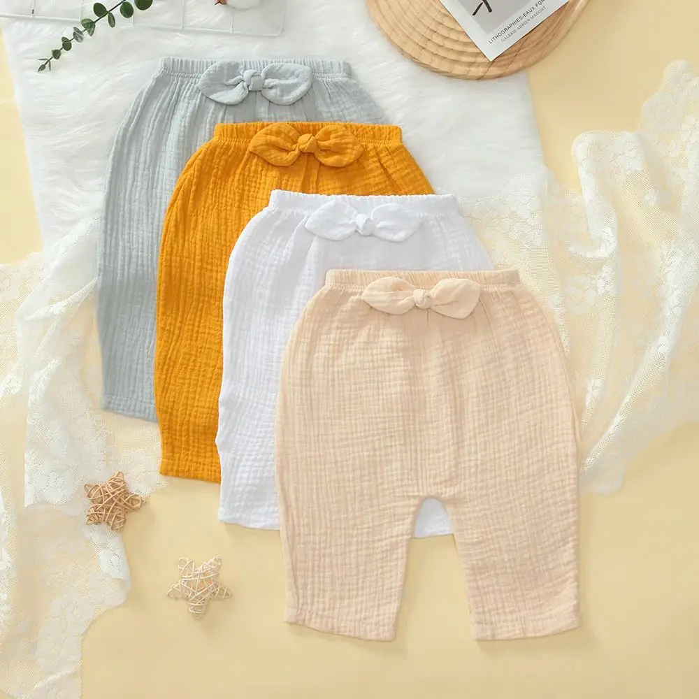 4 Pack Loose Pull-on Baby Pants, Soft Cotton Infants Leggings for Boys and Girls, Cute Bow Design & Solid