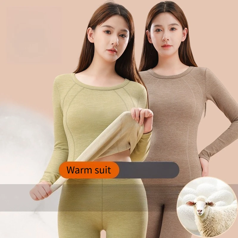 New Women's Thermal Underwear Set De Velvet Grinding Wool Fall Clothing and Pants Thermal Underwear Wome Large Size Solid Colour