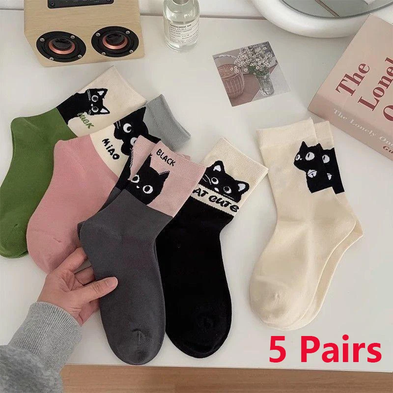 5Pairs Cute Cartoon Cat-themed Socks Cat Color-blocked Mid-calf Socks Spring and Summer Breathable Mid-calf Socks for Women