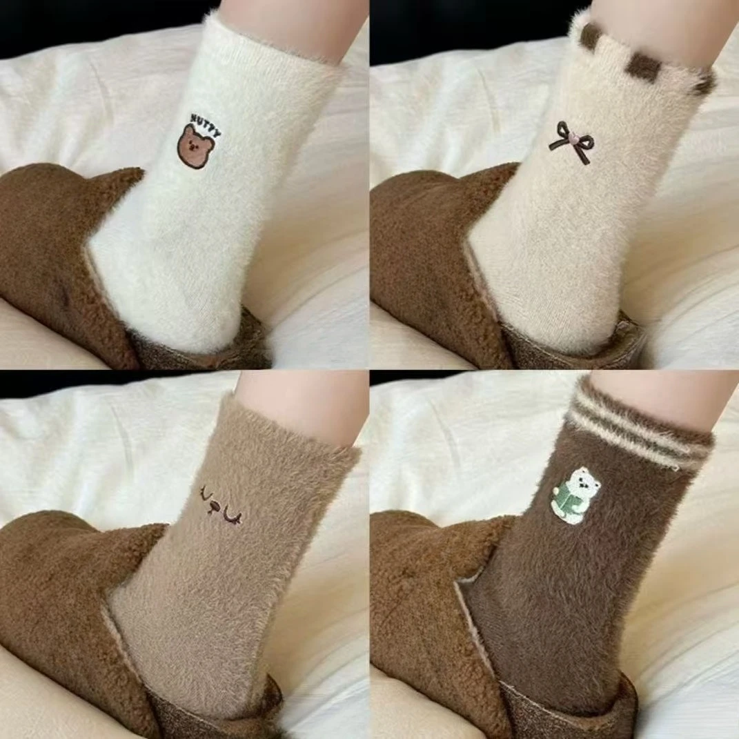 1/4 pair cute cartoon women's comfortable mid tube socks for autumn winter thick warm breathable sweat absorbing casual socks