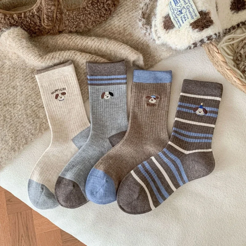 4 pairs of autumn winter cartoon embroidered wool socks for women warm sweat absorbing casual versatile mid tube socks