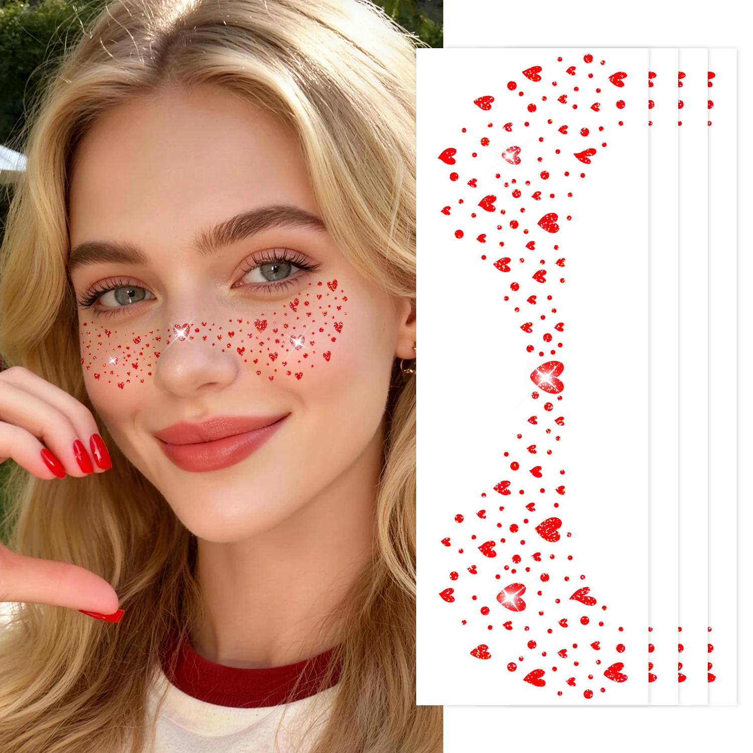 4 Sheets Glitter Heart Spots Face Stickers, Waterproof and Easy to Remove, Spots Position Makeup Stickers, Red Heart Tattoo Desi