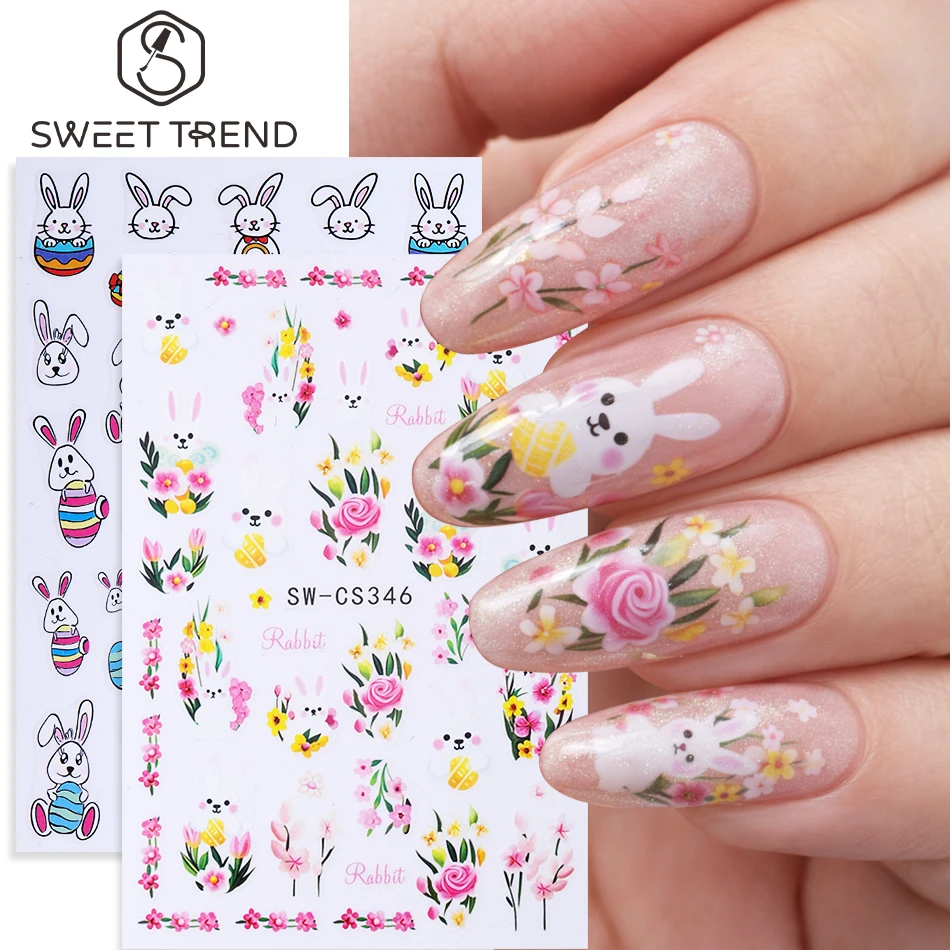 2pcs Easter Day Cartoon Nail Stickers Easter Eggs Bunny Rabbit Flower Design Adhesive Nail Decals DIY Spring Manicure Decoration