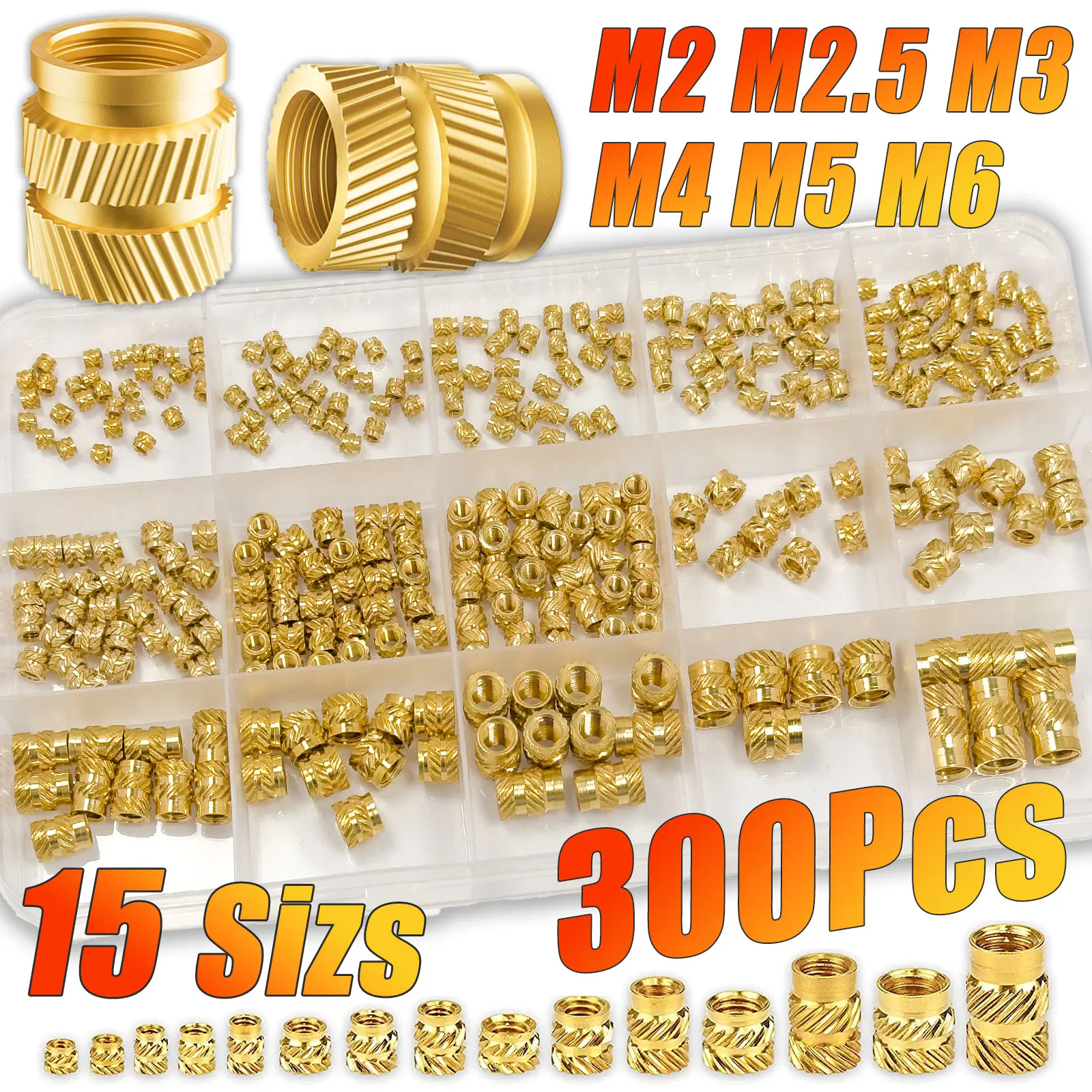 300PCS M2 M2.5 M3 M4 M5 M6 Brass Heat Set Insert Kit, Knurled Threaded Nuts, Compatible with 3D Printing & Plastic Parts