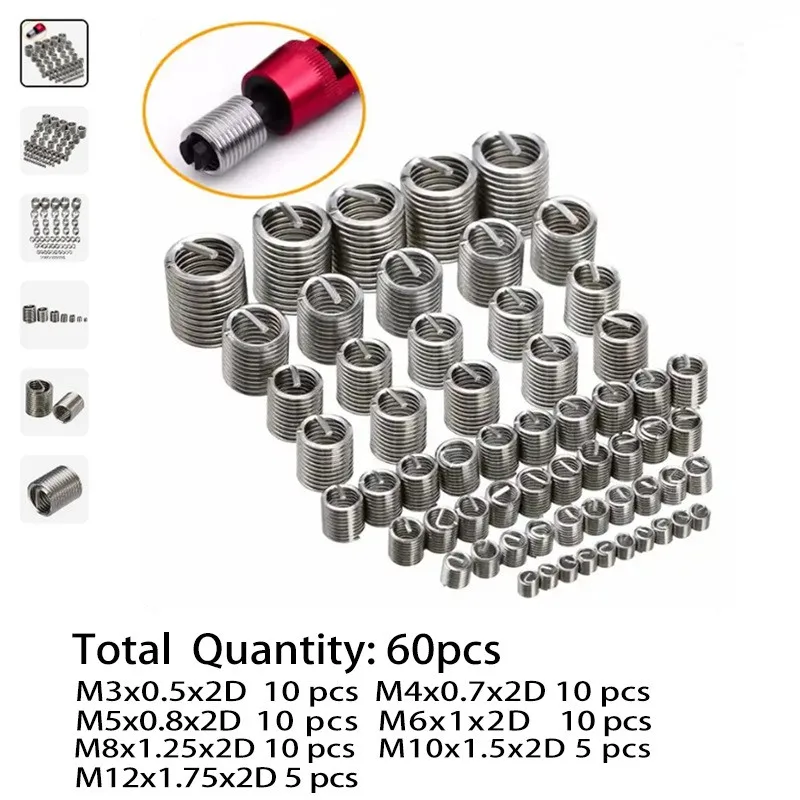 60Pcs Wire Thread Insert M3 M4 M5 M6 M8 M10 M12 Fastening Thread Insert Stainless Steel Spiral Wire Screw Sleeve Wear Repair Kit