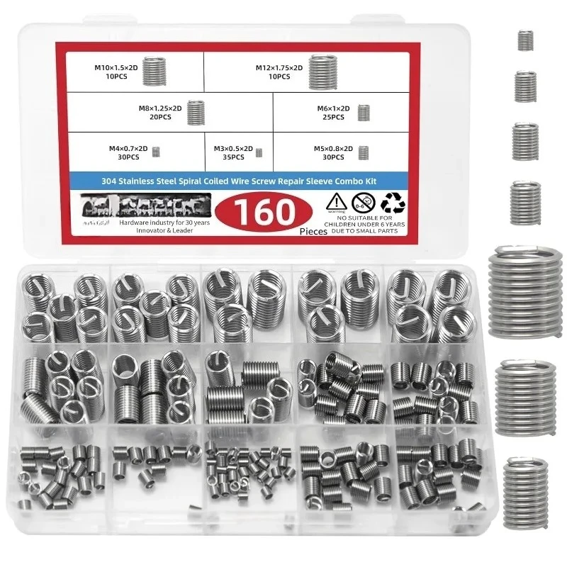 160Pcs Stainless Steel Wire Inserts Screws Sleeve Assortment Kit Thread Inserts Helical Type Repair Sleeve for Automotive Repair