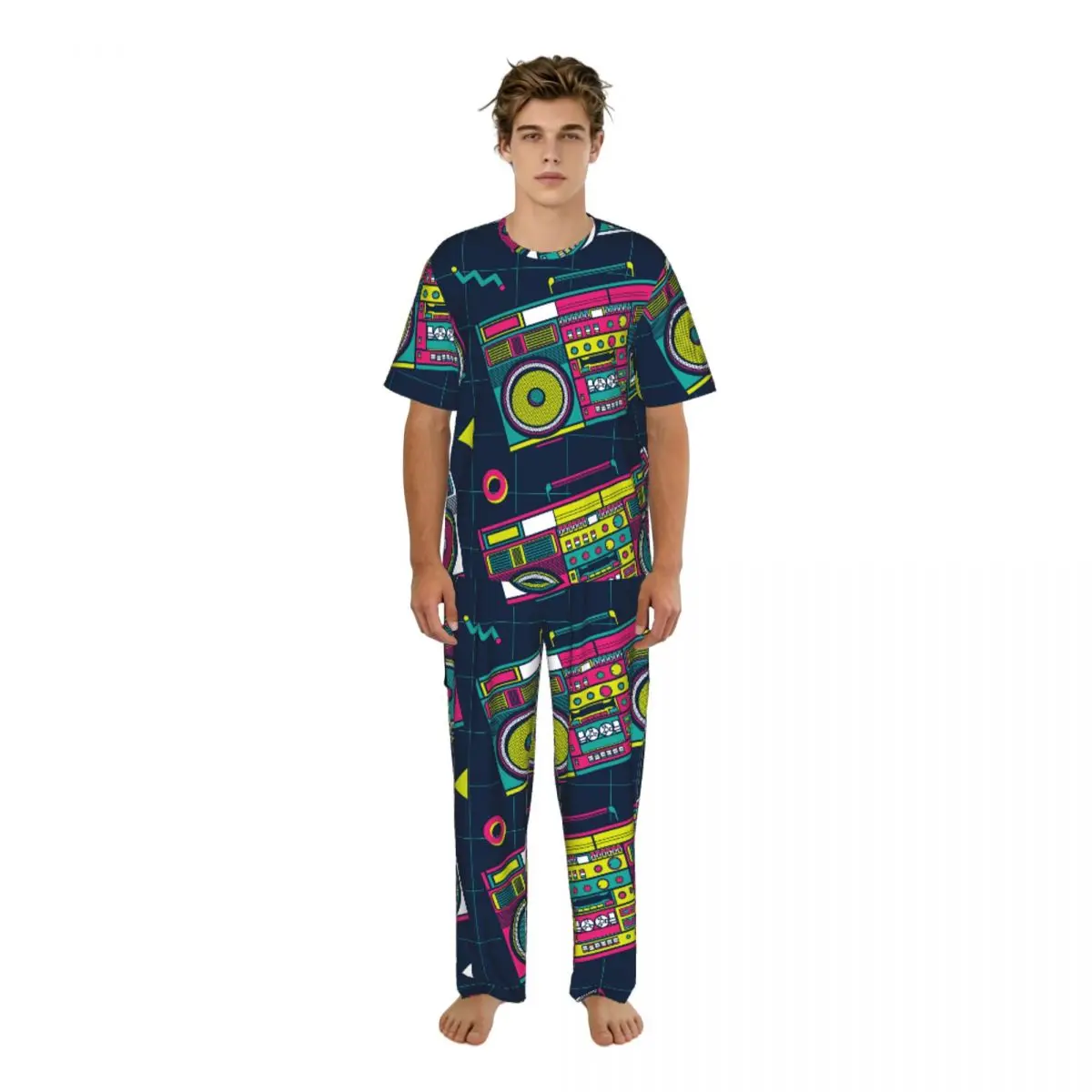 Men Pajamas Set Retro Pop Eighties Boombox Radio 80's Pattern Short Sleeve Spring Summer Lounge Sleepwear Male Nightwear