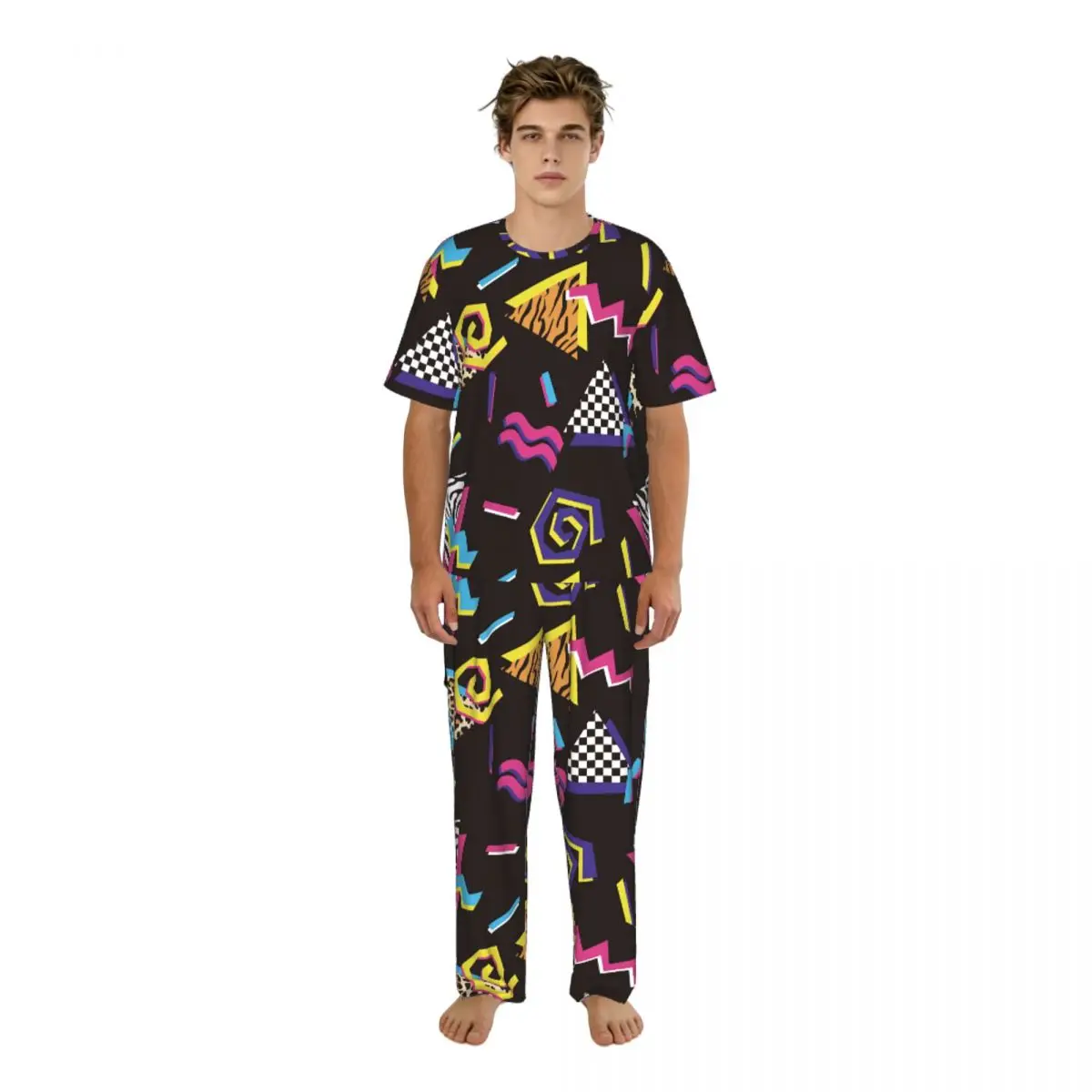 Men Pajamas Suit Short Sleeved Long Pants Abstract Shapes And Animal Prints 90'S Style Sleepwear Summer Home Clothing Set