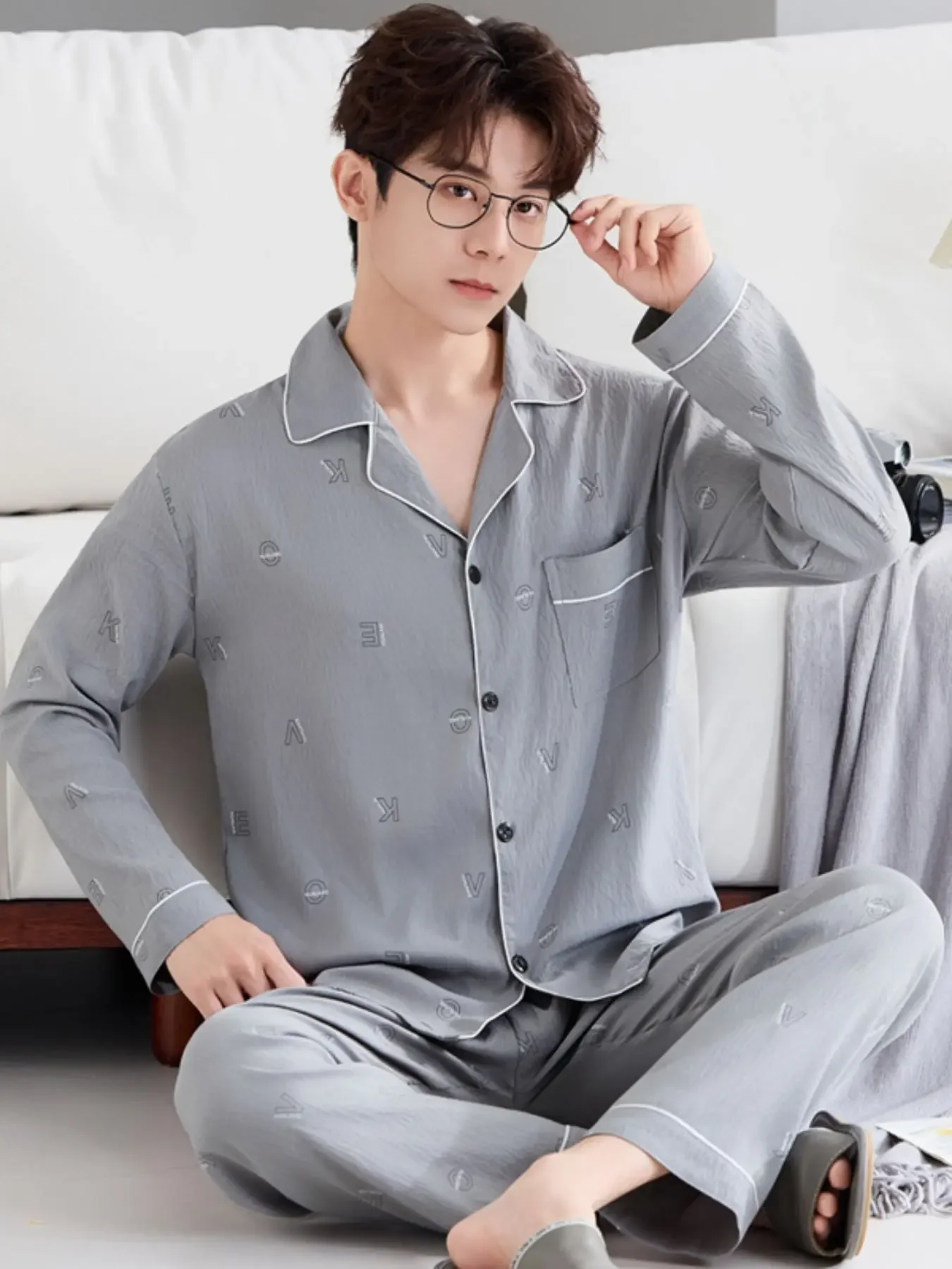 Mens Casual Spring Summer Comfort Pajama Set Fashion Soft Y2K Cardigan Lapel Long Sleeve Top and Long Pants Two-Piece Loungewear