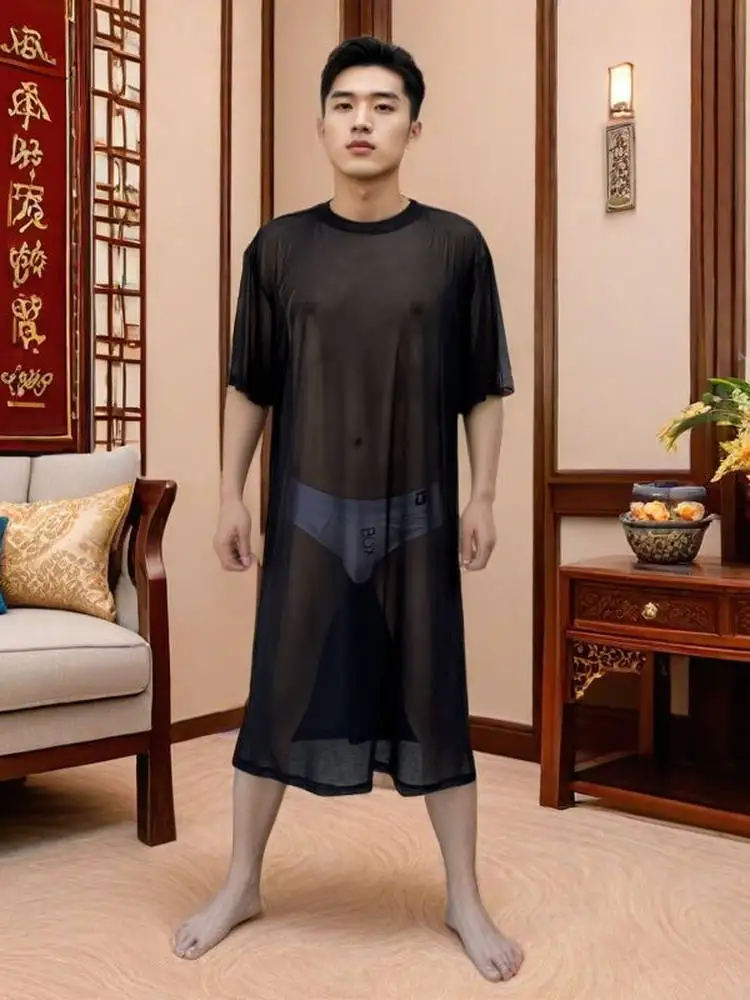 Men's Long Me Batobe Transparent Sensual Home Sp Dring Gown Four-way Stretch Ammonia Lace Comfortable Lightweight