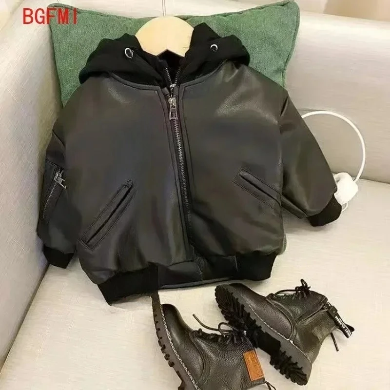 2025 Winter Infant Toddler Kids Fashion Baby Girl Boy PU Leather Jacket Hooded Leather Coat Fashion Chaqueta Thick Clothes