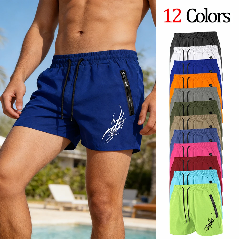 Men's Swim Trunks with Double Zipper Pockets Summer Quick Dry Beach Shorts Tribal Tattoo Print Gym Sport Swimwear 12 Colors