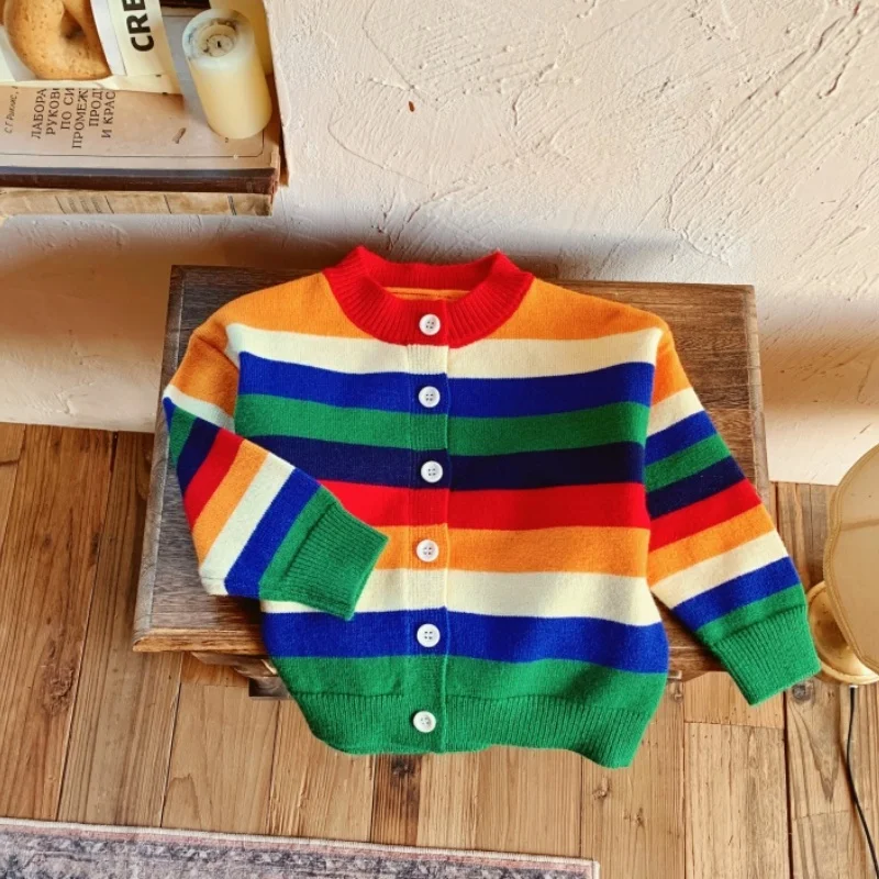Soft Knitted Rainbow Striped Color Block Children's Cardigan Unisex Long Sleeve round Neck Pullover Sweater Inner Wear for Kids
