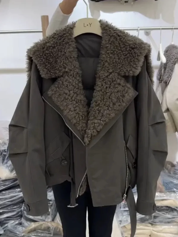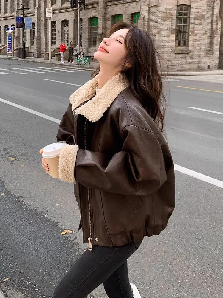 American Retro Biker Leather Jaet Women's Winter Fce Lined Thiened New Lamb Fur Splicing Warm Loose Outerwear