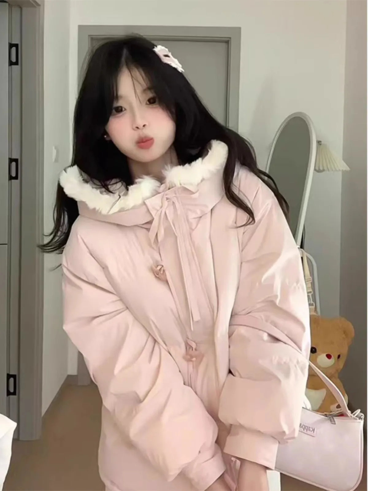 Sweet Soft Pink Buttoned down Padded Cotton Jaet Women's Winter Thi Warm Hooded Coat Retro Sle Long Sve Zipper Closure