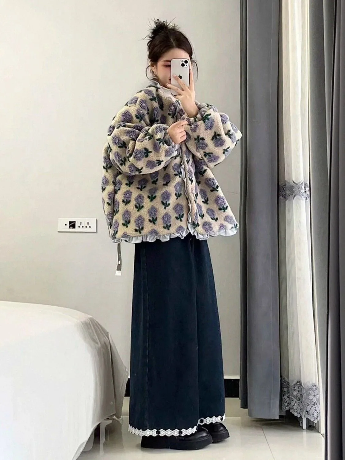 Daisy Bomb Lamb Fur Trim Stand Collar Sweatirt Women's Casual Loose Open Cardigan Outerwear Long Sve Cotton Spring Autumn