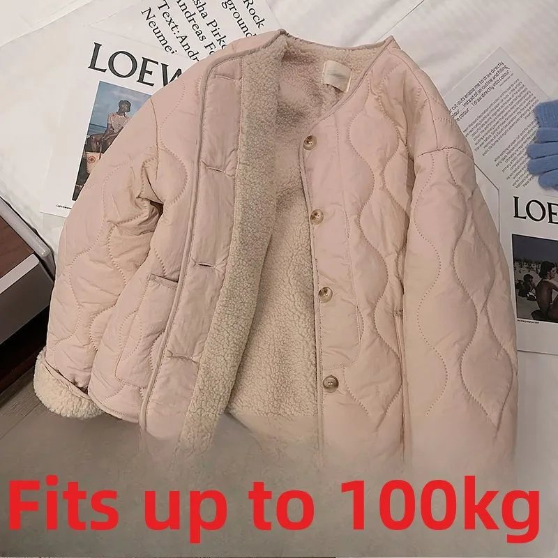 plus Size Pink Lamb Velvet Cotton Jacket round Neck Thickened Winter New Style Korean Women's Casual Fashion Cotton Coat