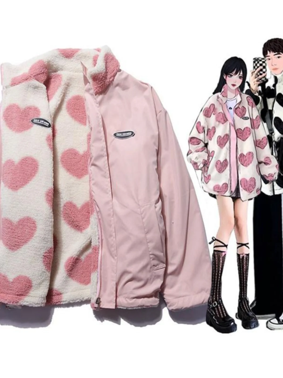 Double-Sided Wear Thickened Lamb Fur Jacket Cotton Coat Heart Patterned Couple's Outerwear Winter 2025 High Street Style