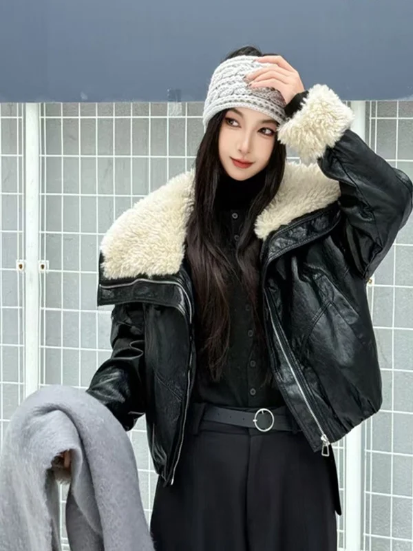 Lamb Fur Collar Fce Lined ort Biker Jaet Women's Thiened Winter Coat Vintage Sle Long Sve Outdoor Warm Leather