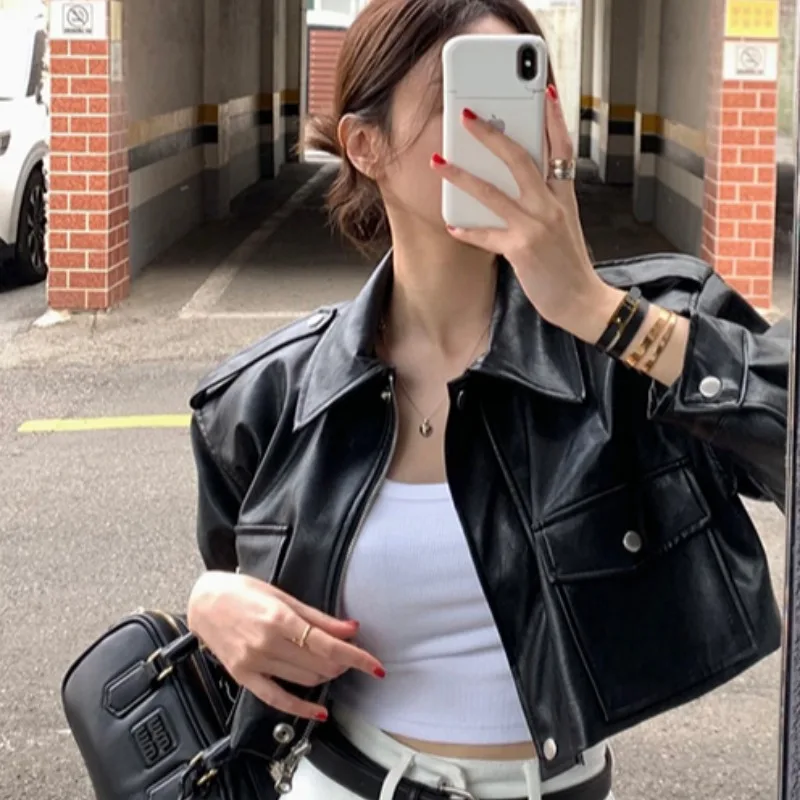 Ailegogo Streetwear Women Retro Loose Short Pu Faux Leather Jacket Spring Autumn Female Zipper Coat Vintage Moto Biker Outwear