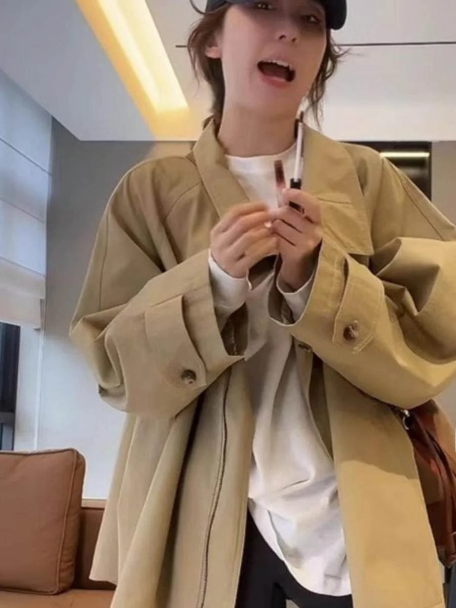 Korean Style British Windbreaker Women's Khaki Spring Loose Fit Fashionable Unique Long Sleeve Zipper Closure Coat Casual