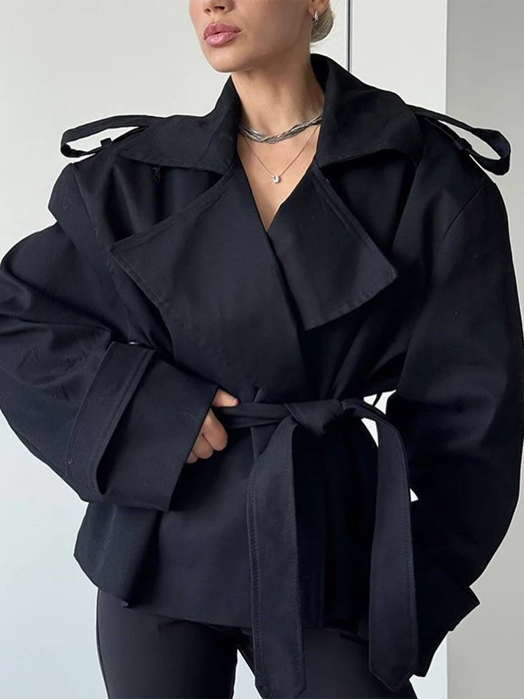 Casual Solid Lace-up Short Trench Coat Lady Chic Stand Collar Wide Shoulder Full Sleeve Loose Coats 2026 Women Daily Windbreaker