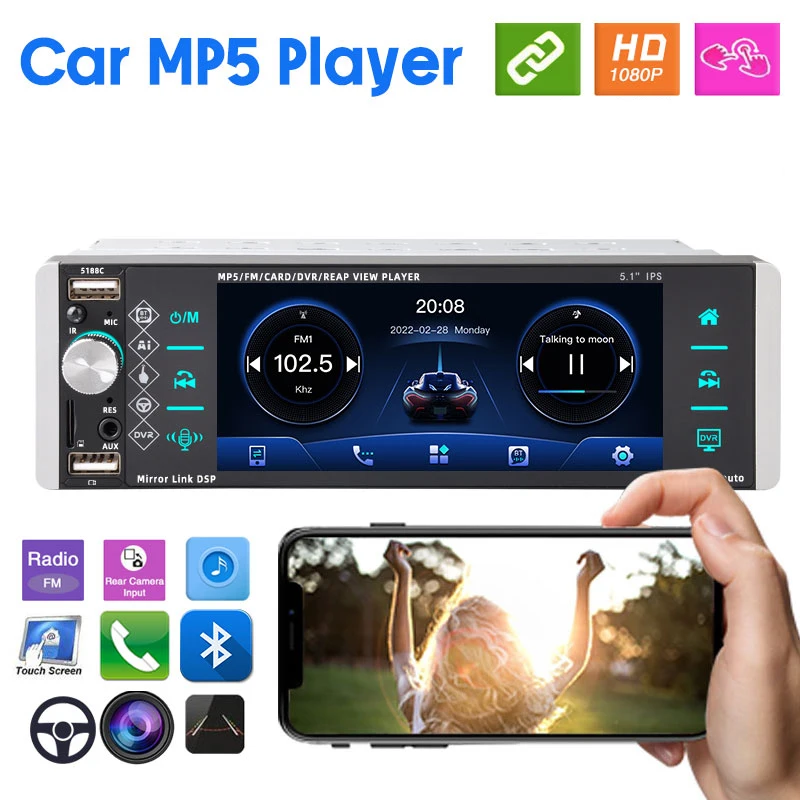 5188C Single-Spindle Car MP5: 5.1-Inch IPS Touch Screen, CarPlay, Voice Control & 3 USB Interfaces