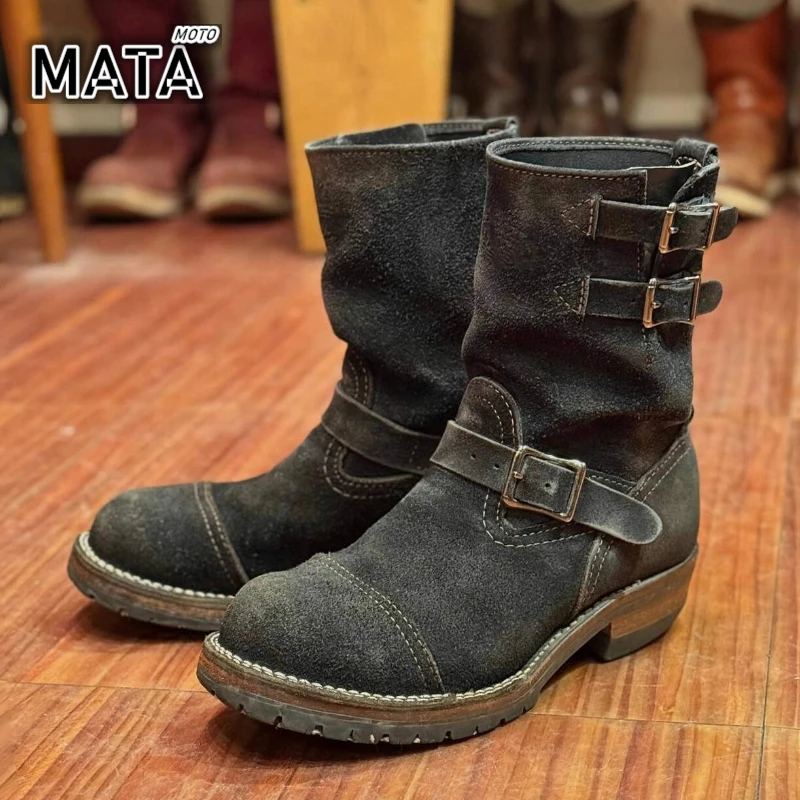 Motorcycle Round Toe Platform Shoes,Genuine Leather Belt Buckle Strap Low Heel Boots,Handmade Vintage Mid-Calf Boots