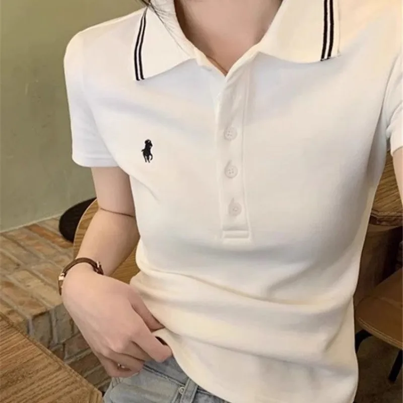 Women Summer Simplicity Office Lady Solid Color Polo Collar Short Sleeve T-Shirt Ladies Fashion Embroidered All-match Trend Tops