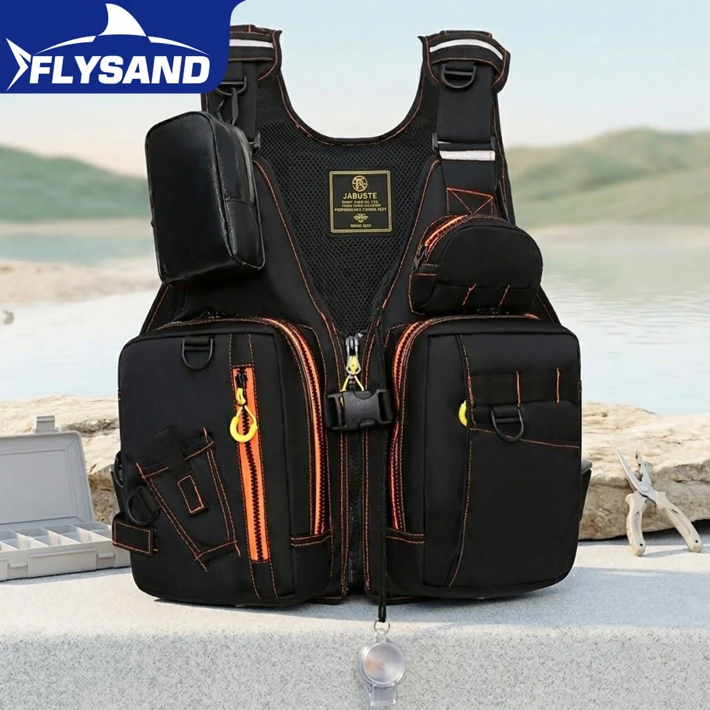 Outdoor fishing life jacket vest with multiple pockets for storage buoyant materials and safety gear ideal for all day fishing