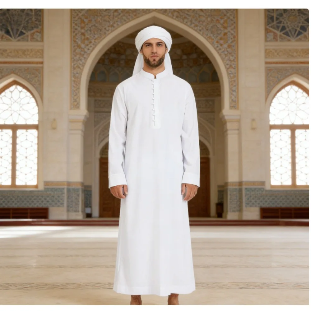 2025 Arabic Style Men’s Long Hooded Shirt Minimalist Muslim Robe Thobe