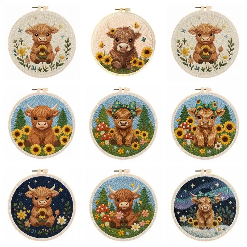DIY Punch Needle Embroidery Kits for Beginners Cute Cartoon Highland Cow with Sunflower with Hoop Punch Set Easy for Adults Gift
