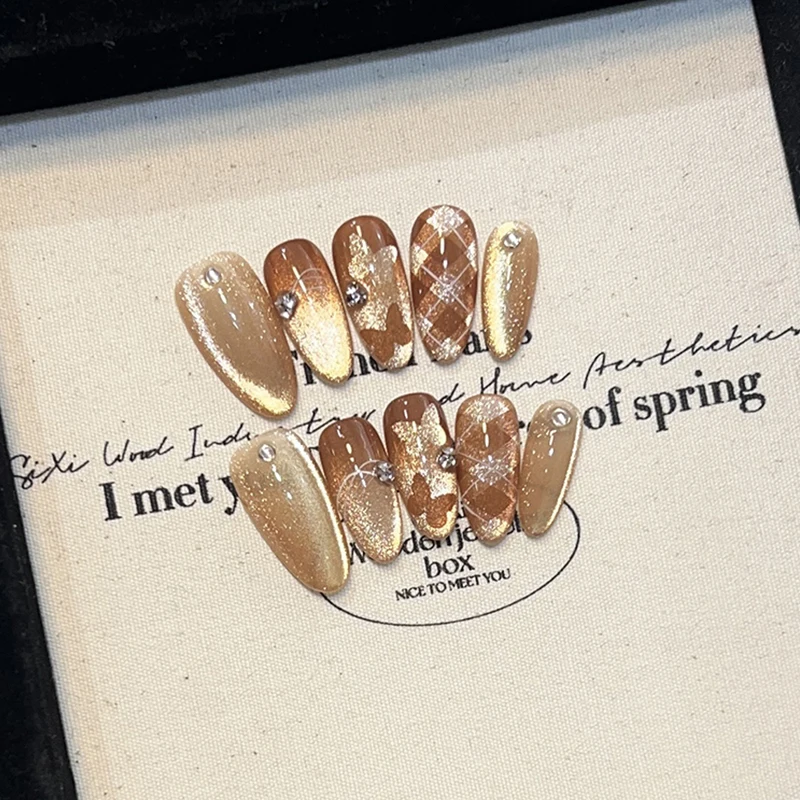 10pcs Press on Nails Handmade Grid Brown Cat Eye False Nail Tips Glitter Diamond Butterfly Wearable Short Oval Fake Nails